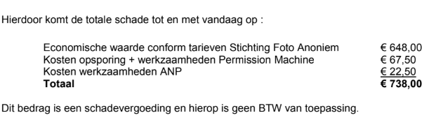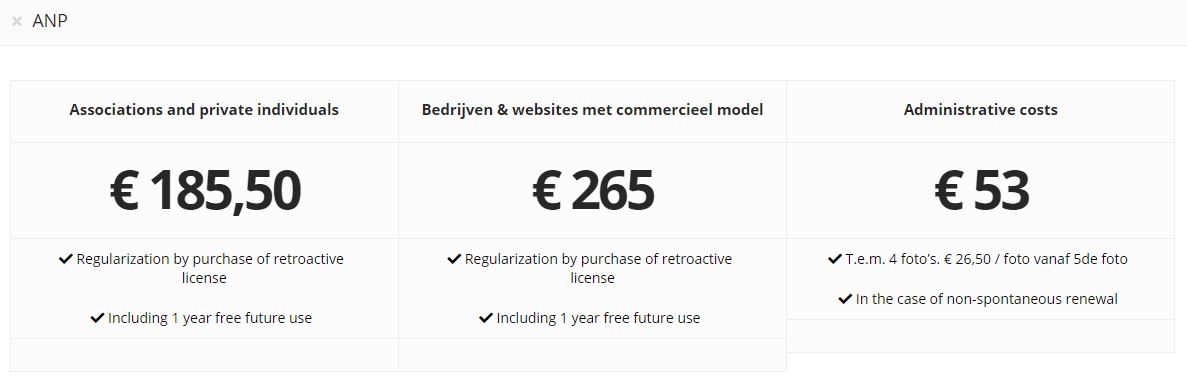 Inbreuktarieven van ANP op de site van Permission Machine. |