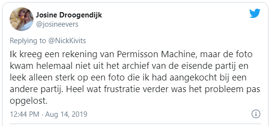 In Nederland heeft Permission Machine deze status niet. In Nederland jagen ze in opdracht van onder andere ANP op foto’s en wordt gerechtsdeurwaarder Rosmalen Nedland ingeschakeld om te procederen.