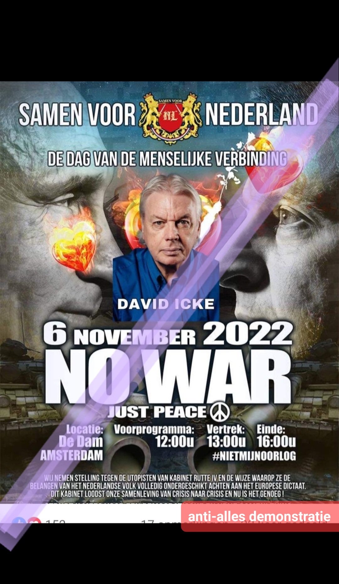Bij de demonstratie van ‘Samen voor Nederland’ op 6 november zal complotdenker David Icke op De Dam in Amsterdam een ’toespraak’ houden. Icke gelooft o.a. in ‘reptielmensen’ (‘reptilians’) die een geheime wereldregering vormen, en is een bron van inspiratie voor fascistische psychopaten als Thierry Baudet.