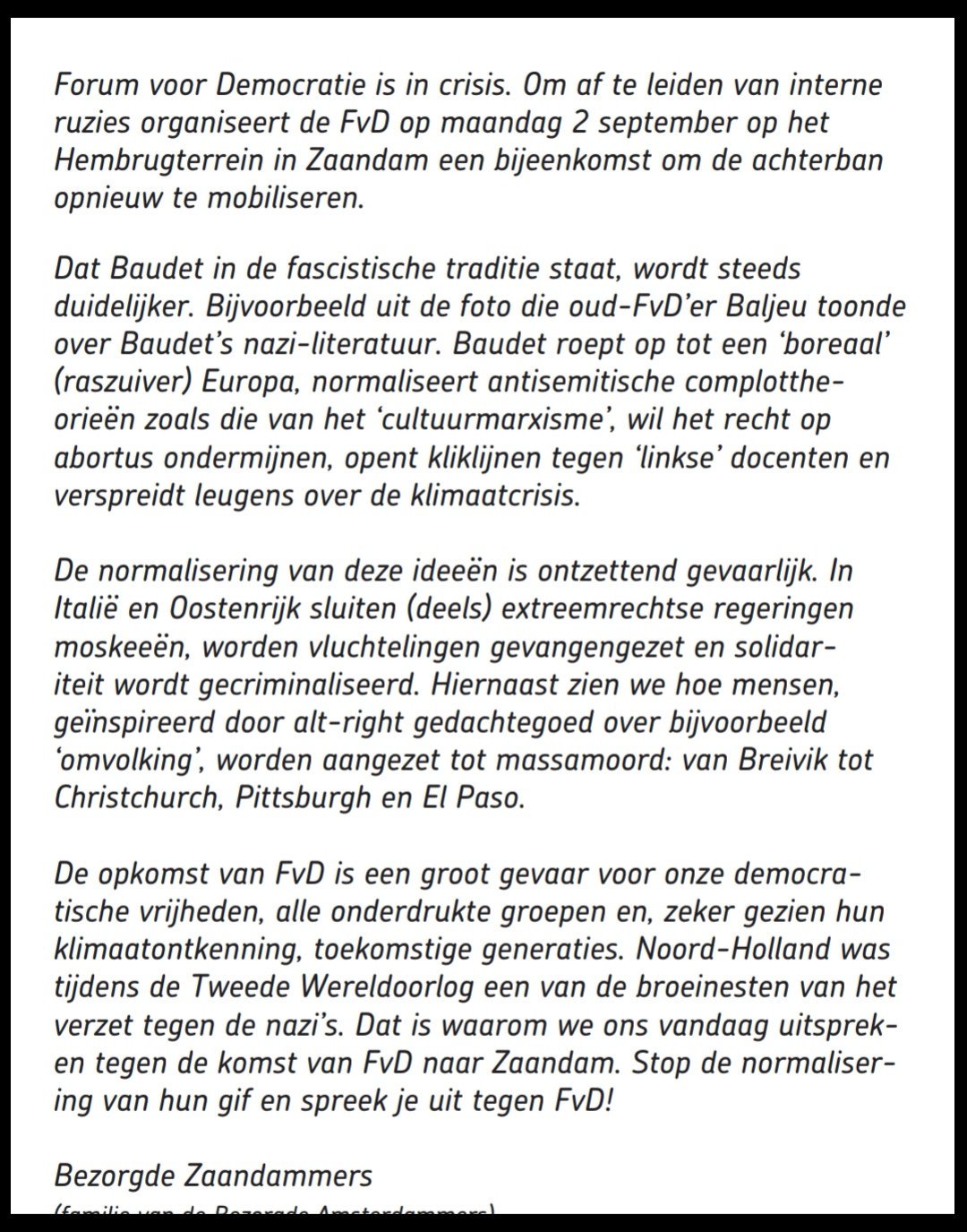 Het fascistische Forum voor Democratie organiseert vanavond op het Hembrugterrein in Zaandam een bijeenkomst, waarschijnlijk vooral om de aandacht af te leiden van de interne perikelen (gisteren liep weer een FVD-Statenlid over naar Henk Otten). Niet iedereen in de Zaanstreek is even gelukkig met de komst van de boreaaltjes. Onderstaande flyer werd vandaag verspreid in Zaandam: