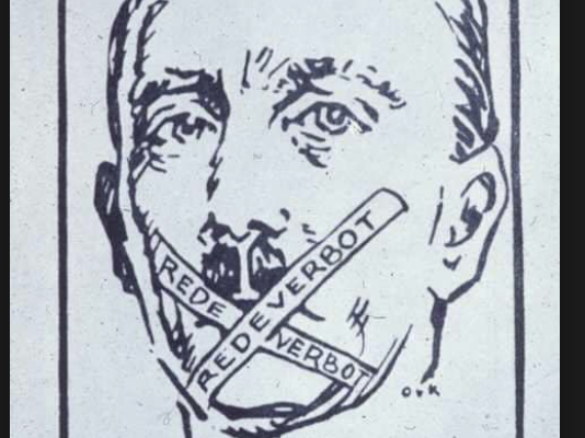 Uitgelichte afbeelding: het is natuurlijk niet voor het eerst dat extreemrechts zich met een schijnheilig gezicht en vochtige ogen beklaagt over de afschuwelijke wijze waarop links haar de mond snoert. Hier een afbeelding van Hitler uit het antisemitische schendblad Der Stürmer die volgens de nazi’s ‘als enige van de 2000 miljoen mensen op Aarde in Duitsland de mond gesnoerd wordt’.