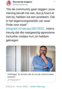 Niet iedereen in de LHBTI-gemeenschap  was even gecharmeerd van Huffnagel’s populistische gebazel, wat leidde tot felle reacties op sociale media.