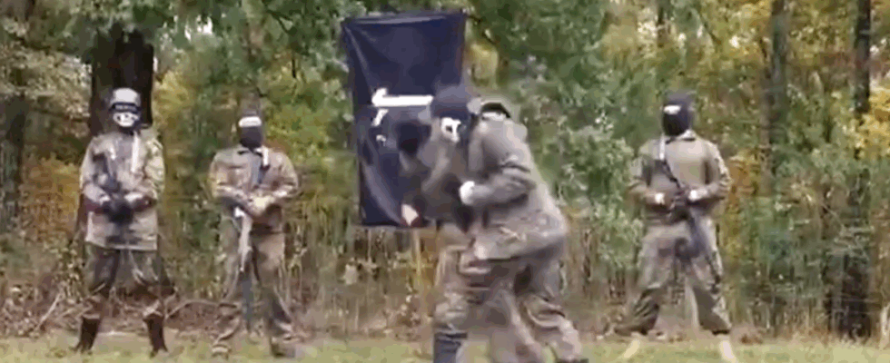 Uitgelichte afbeelding: Leden van The Base tijdens een paramilitaire training (screenshot Youtube)