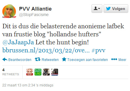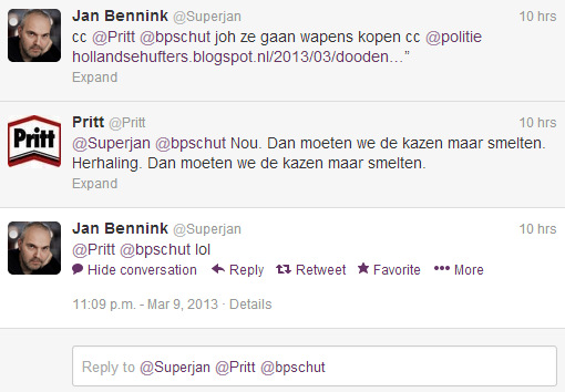 Hoe verzin je het? En dit allemaal vanwege 1 tweet van mij. Daar stond ik dan, met naam en toenaam in een stuk van Bas Paternotte op het blog van Bert Brussen beiden opgestookt door Jan Bennink waarin ik in verband word gebracht met vuurwapens. Met mijn kop in hun virtuele schandpaal vol leugens voor het leven. Leuk als ik weer eens moet solliciteren of zo. Ja, als je niet te spreken bent over Geenstijl en/of Powned dan moet je worden aangepakt. Keihard. Want vrijheid van meningsuiting geldt alléén voor de Roze Khmer. De tienduizenden volgers (de virtuele knokploeg) van deze mannen op twitter deden wel even de rest. Ik werd bedreigd, vogelvrij verklaard en ze probeerden mijn werkgever te achterhalen ‘Let the hunt begin‘.