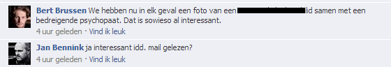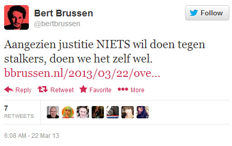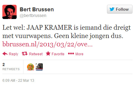 Prachtig, zo’n kijkje achter de schermen. Afijn, de volgende dag, 22 maart, ben ik volgens Bert Brussen iemand die met vuurwapens dreigt. Dat niet alleen, hij chanteert mij en speelt voor eigen rechter. Way to go Brussen! You Rule. Big Time!