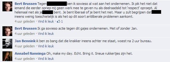 21 maart dit jaar brak de hel los. Jan Bennink, Bert Brussen (Volkskrantcolumnist en Hoofdredacteur The Post Online) en Annabel Nanninga (Typgeit bij Geenstijl. ex-panellid Rijdende Rechter) vonden het hoog tijd om mij eens aan te pakken. Ik moest ook maar eens ‘deaud of zeau‘ vanwege een andere mening. Deze Facebookscreenshots spreken voor zich: [1], [2] en [3].