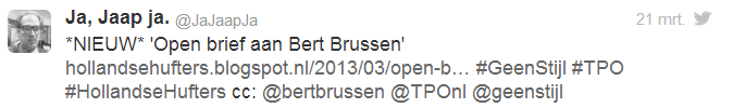 Ik citeer Bas Paternotte’s eerste leugen over mij (Brussen’s blog, 22 maart 2013): “Die auteur van Hollandse Hufters in kwestie heet dus Jaap [K…] Dat weet ik omdat hij donderdag op zijn twitter-account meldde een open brief aan mijn vriend en hoofdredacteur Bert Brussen te hebben geschreven.”